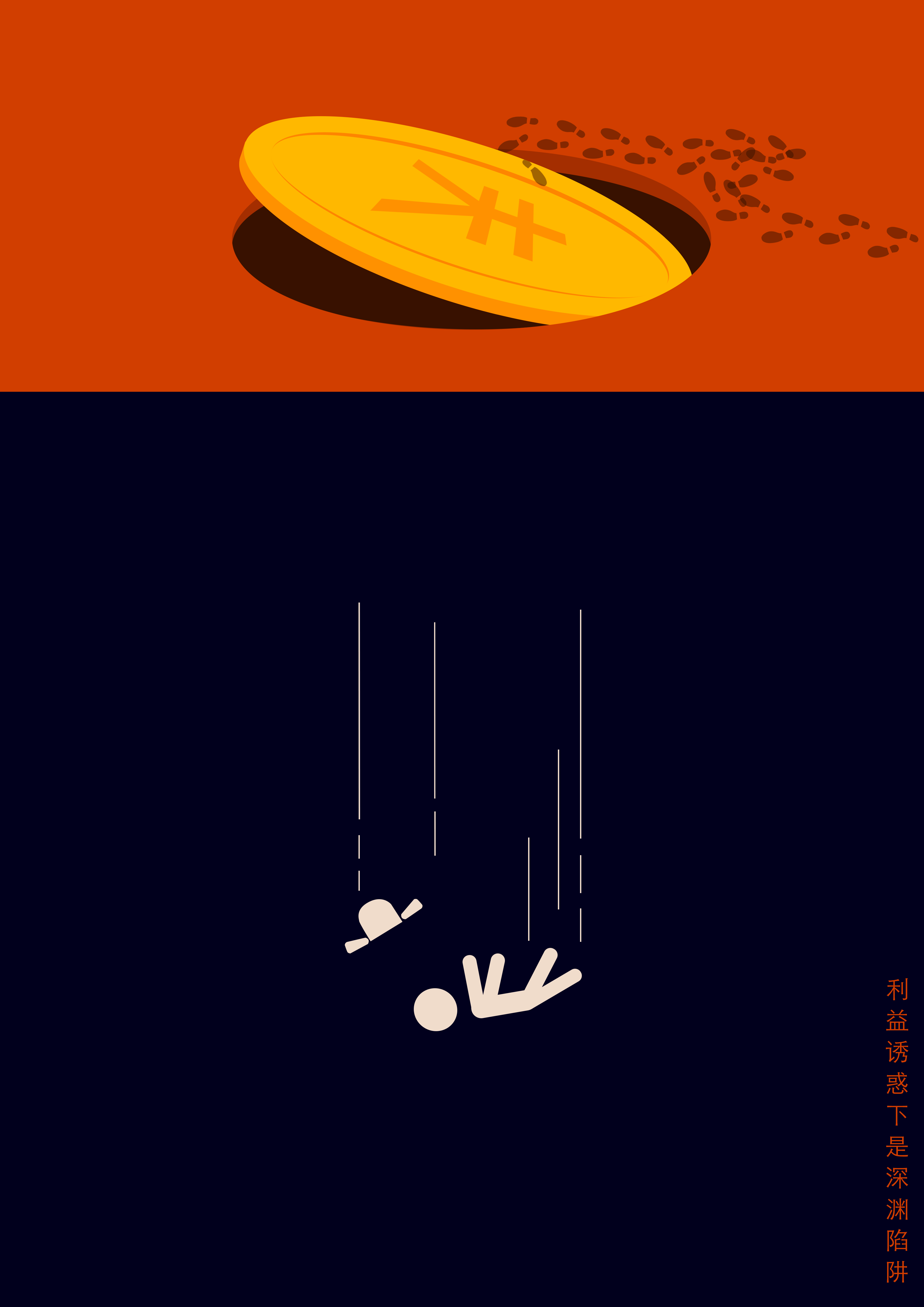 作品《陷阱》使用图形化的方式,表现了“人”在金币陷阱附近徘徊、踏入陷阱、坠落深渊的场景。画面采取垂直线构图,将背景一分为二,主要元素居中,体现出构图的形式美感。背景色大面积为深蓝色,小部分为橙色。橙色意为光明,深蓝则指代深渊的黑暗,对比色在增强视觉冲击力的基础上增加画面的意味。借此作品,警示人们在利益的诱惑下面是无尽黑暗的陷阱。
